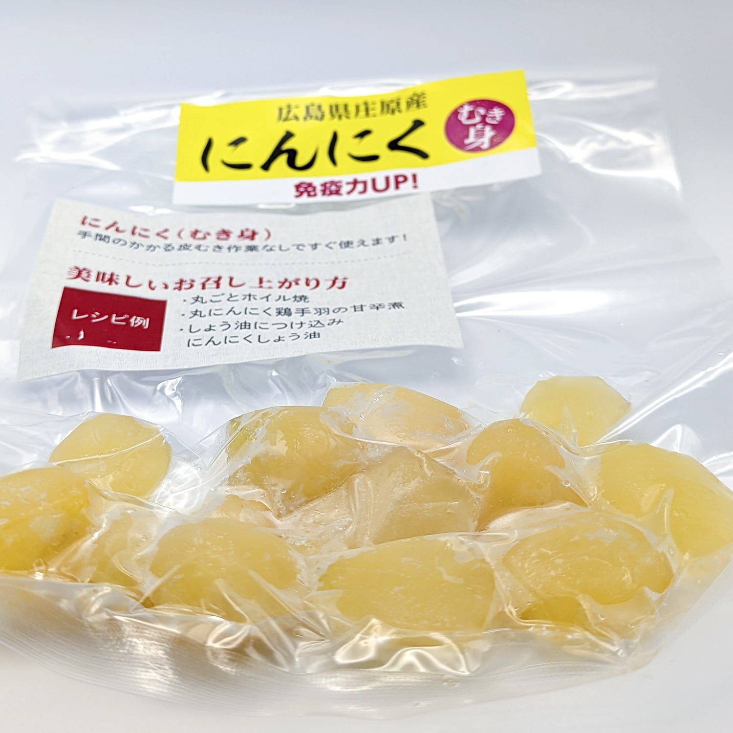 庄原市口和産の新鮮なにんにくを手間いらずの皮むき状態で冷凍しました。香り高い風味が料理を一層引き立て、料理の幅を広げます。いつでも手軽に使用できるので、忙しい日でも手軽に美味しい料理を楽しむことができます。そのまま醬油に漬け込んだ「にんにく醬油は絶品です。