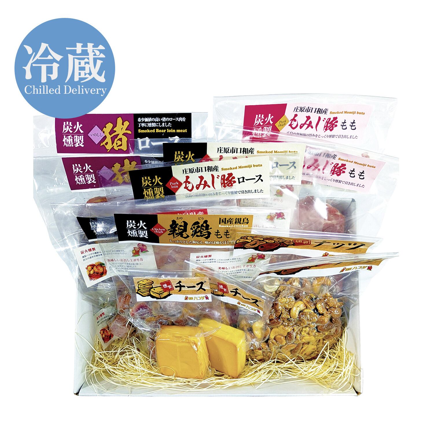 内容・・燻製猪ロース×2、燻製もみじ豚ロース×2、燻製もみじ豚もも×2、燻製熟成鶏×1、燻製親鶏×1、燻製チーズ×2、燻製ナッツ×2